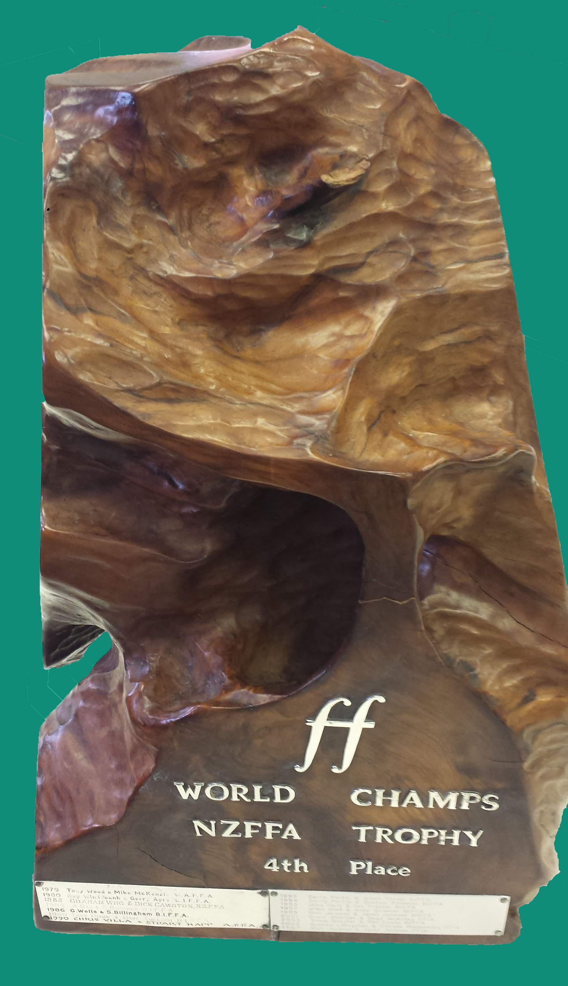 The New Zealand National Trophy - a Kauri wood sculpture was presented in 1980 by FFNZA to be awarded to the Fourth boat in the World Championship.